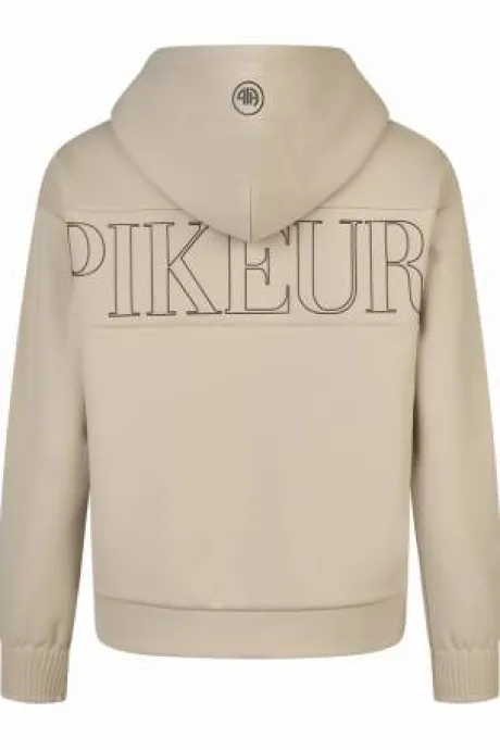 Elle est dotée de deux poches kangourou pour un rangement facile et d’une capuche avec cordon de serrage pour un ajustement personnalisé. L’imprimé métallisé en relief sur la capuche et la poche, ainsi que le large logo Pikeur dans le dos, ajoutent une touche de style moderne à cette pièce essentielle de votre garde-robe.