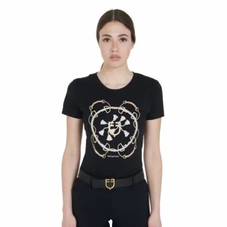 Tee shirt en coton slim fit pour femmes avec manches courtes, parfait pour la saison estivale car il est respirant, élastique et frais. Il garantit un excellent ajustement, une liberté de mouvement maximale et un confort unique. Le t-shirt est décoré d’un dessins avec des mors