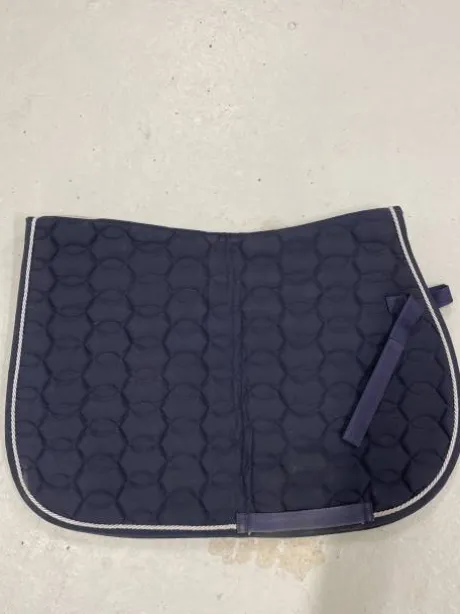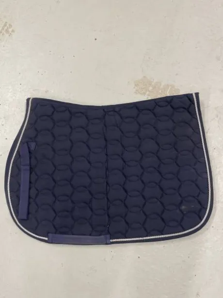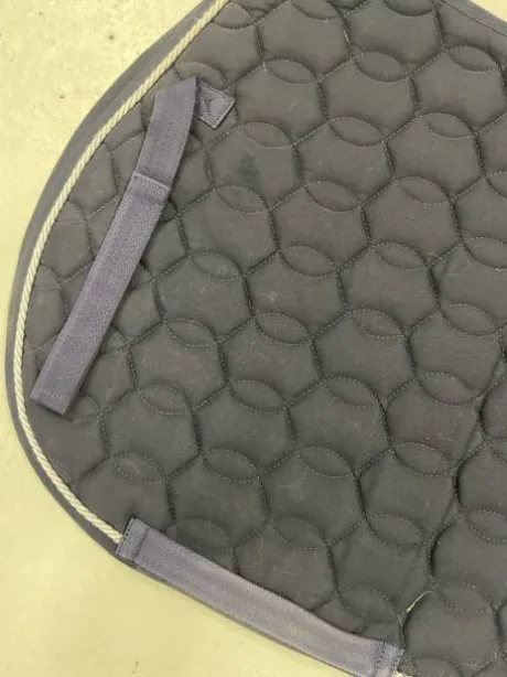 Tapis bleu marine, avec une bande blanche tout autour, deux passants pour la sangle et d’autres passants pour la selle