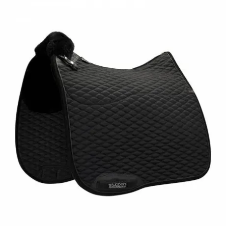 Tapis de selle Stubben doublé mouton véritable avec rebord extérieur avant pour apporter plus de stabilité au tapis.