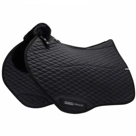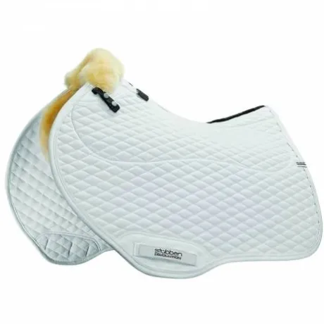 Tapis de selle Stubben doublé mouton véritable avec rebord extérieur avant pour apporter plus de stabilité au tapis.