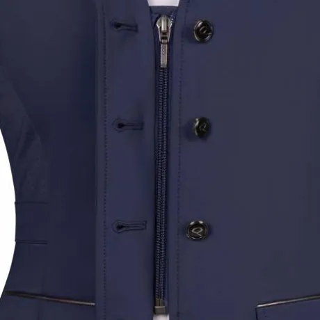 - Passepoil autour du col et sur le rabat des poches latérales. Pin’s QHP sur le bras gauche. Double fente. Tirette cachée sous les boutons.