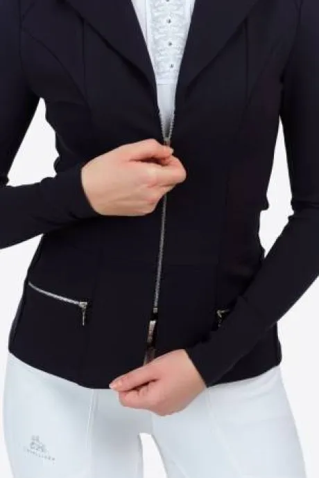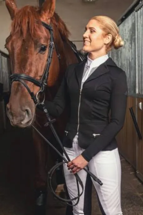 La veste de concours ZIP CHIC de Cavalliera est conçue en tissu jersey extensible, alliant confort et esthétique minimaliste. Sa coupe blazer courte et sa fermeture éclair en font un choix idéal pour les cavaliers recherchant un look raffiné tout en permettant une liberté de mouvement optimale grâce à la technologie Second Skin.